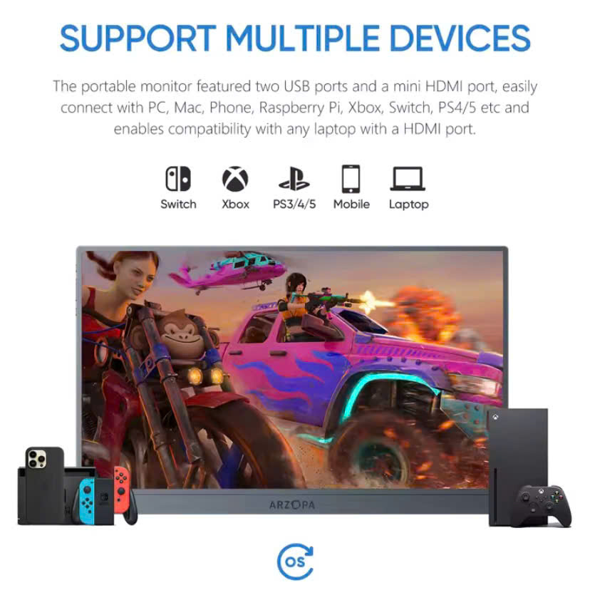 Arzopa G1 Game Max tương thích với nhiều thiết bị, bao gồm các dòng laptop của Apple, Huawei, Microsoft, Asus, MI, Lenovo, HP, Dell, Google, Razer, và Nvidia. Đối với điện thoại, màn hình hỗ trợ các dòng như Samsung, Huawei, Razer, Sony, Nokia, Asus, Oppo, LG, HTC, Apple iPhone (yêu cầu bộ chuyển đổi Lighting to HDMI) và nhiều thiết bị chơi game khác như Nintendo Switch, Xbox, PS3, PS4, PS5. Ngoài ra còn có thể dùng với các bị xuất hình ảnh khác như: máy ảnh, fly cam…